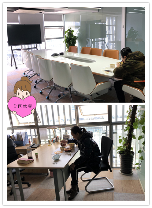? 公司合理分配員工用餐時間,利用就餐區(qū)、會議室、個人辦公室、接待室等,實行分區(qū)用餐、分批用餐、錯峰用餐,降低人員就餐密